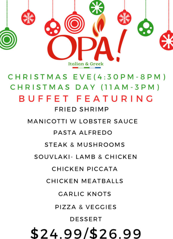 Thanksgiving Buffet Christmas Eve and Christmas Day Buffet NYE Surf and Turf specials and menu! NYD All you can eat buffet! Holiday caterings and private parties available. Call 515-433-3088. OPA!