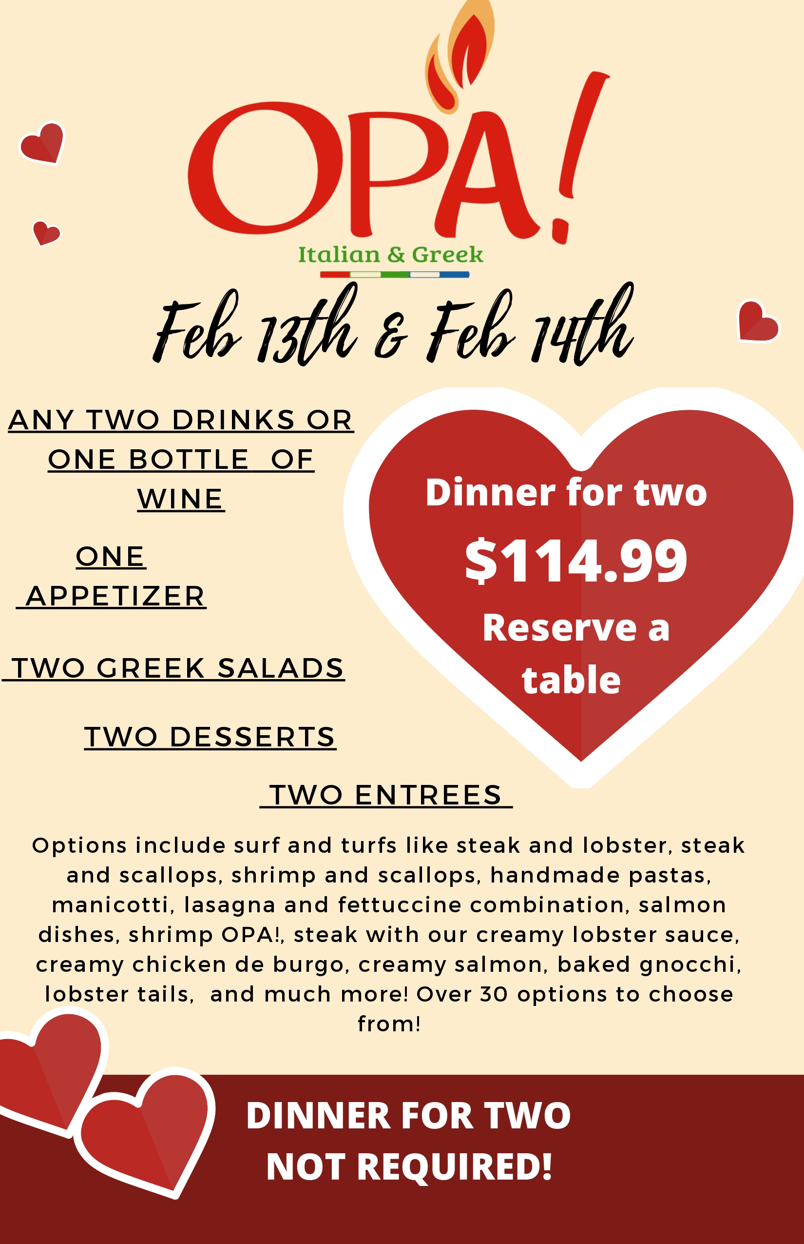 Two entrees Options include surf and turfs like steak and lobster, steak and scallops, shrimp and scallops, handmade pastas, manicotti, lasagna and fettuccine combination, salmon dishes, shrimp OPA!, steak with our creamy lobster sauce, creamy chicken de burgo, creamy salmon, baked gnocchi, lobster tails, and much more! Over 30 options to choose from!