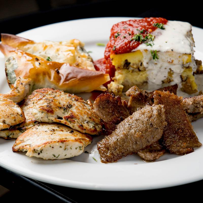 Moussaka, spanakopita, gyro meat, and chicken souvlaki.