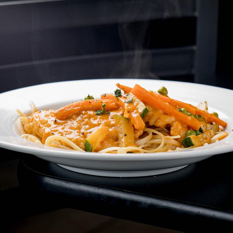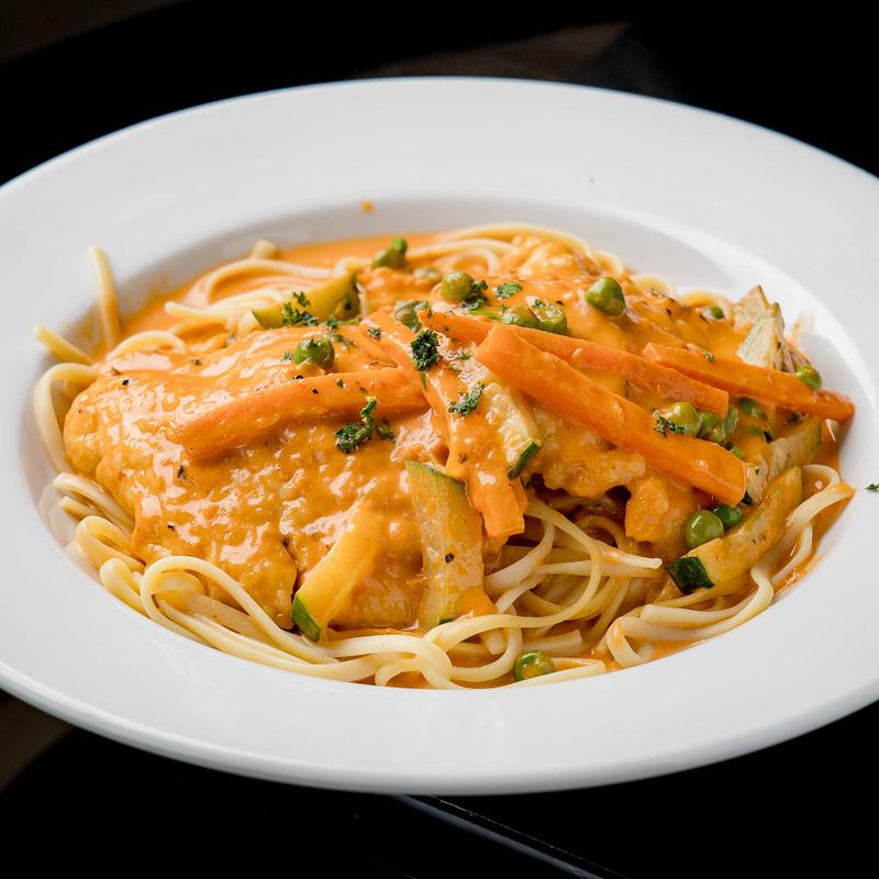 Linguine pasta tossed in a tomato and cream sauce, mixed with zucchini, carrots, and peas. (GF) • Add chicken $2.99 | Add Shrimp $4.99