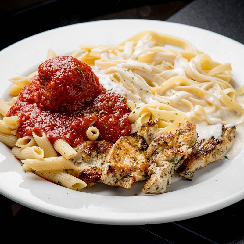 Pasta with marinara and a meatball, fettuccine alfredo, and chicken. Served with a side salad.