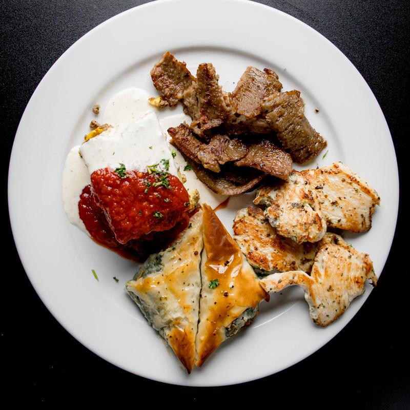 Moussaka, spanakopita, gyro meat, and chicken souvlaki. Includes a side salad.