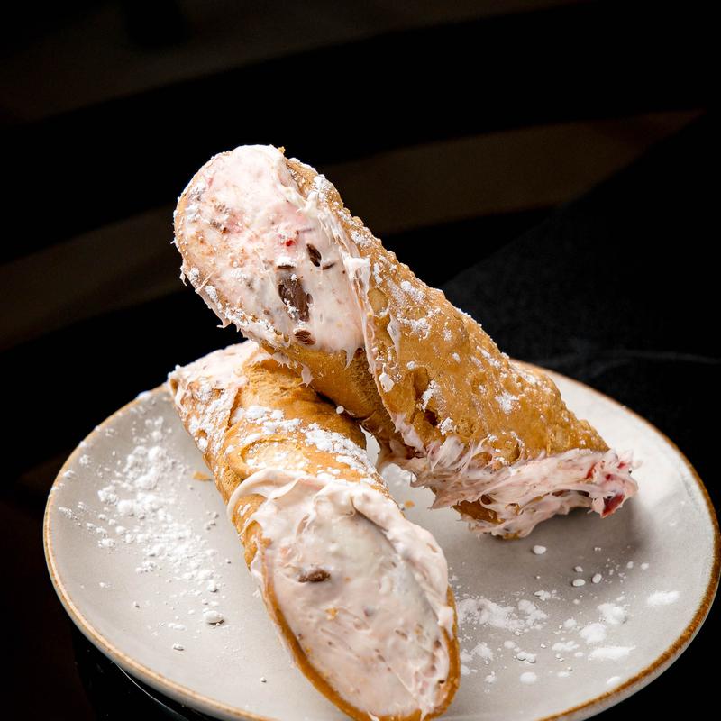 Cannoli shell filled with sweet cream, cherries, chocolate, and cheese. Two for