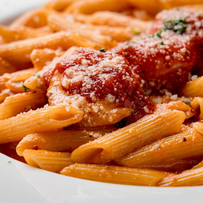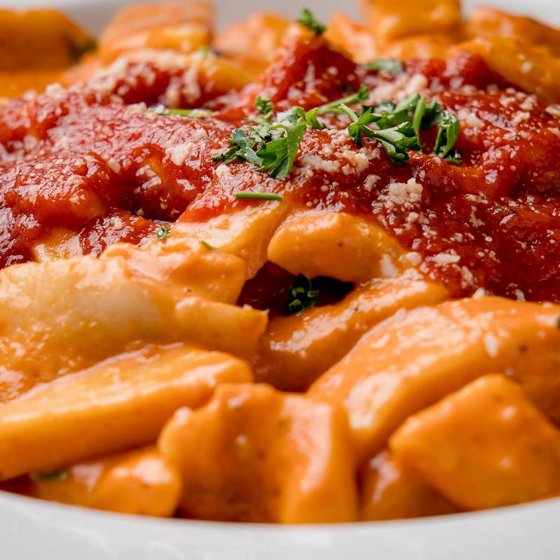 Creamy tomato sauce tossed in penne pasta, mild or wild. (GF) • Add Chicken $2.99 | Add Sausage $2.99 | Add Shrimp $4.99